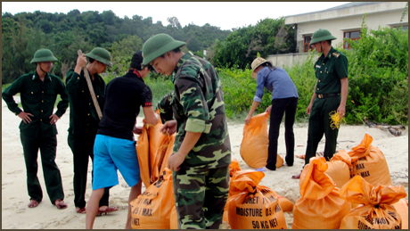 | Lực lượng biên phòng, nhân dân, lực lượng dân quân tổ chức gia cố, tăng cường bao cát chặn, chống sạt lở ở đảo Cô Tô (Ảnh:baoquangninh) |