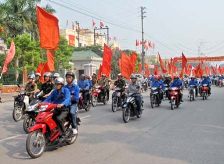 | Đoàn viên, thanh niên diễu hành tuyên truyền về an toàn giao thông. Ảnh: Ninh Đức Phương- TTXVN |