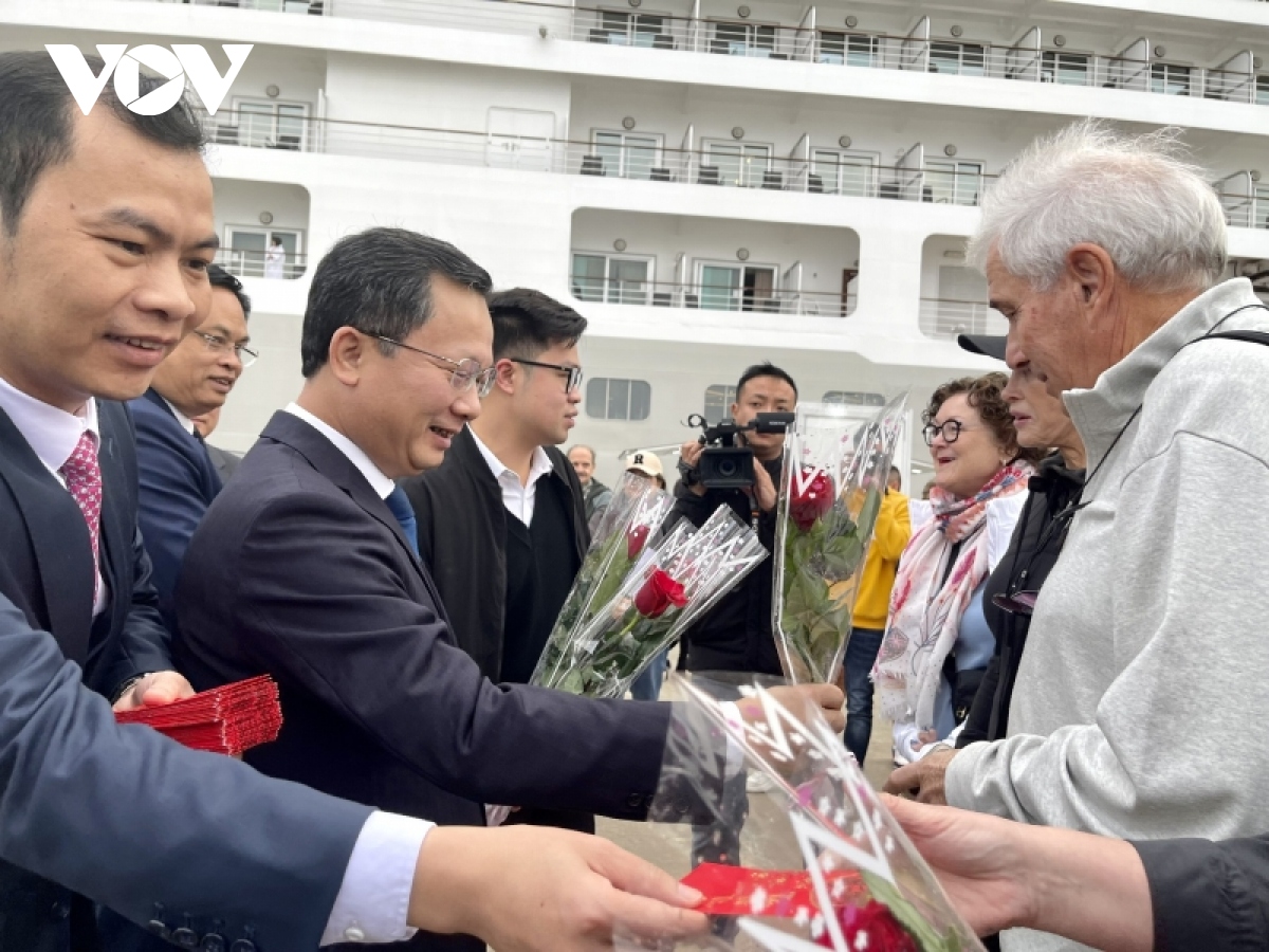 Lãnh đạo tỉnh Quảng Ninh tặng hoa và "lì xì" cho những du khách quốc tế đầu tiên tới Quảng Ninh trong sáng 1 Tết. Ảnh: VOV |