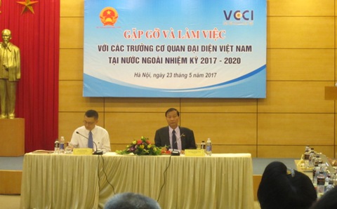 Ngày 23/5, Phòng Thương mại và Công nghiệp Việt Nam (VCCI) phối hợp với Bộ Ngoại giao tổ chức gặp mặt các trưởng cơ quan đại diện Việt Nam tại nước ngoài nhiệm kỳ 2017- 2020, nhằm thúc đẩy các hoạt động xúc tiến thương mại, đầu tư giúp các doanh nghiệp trong nước phát triển.