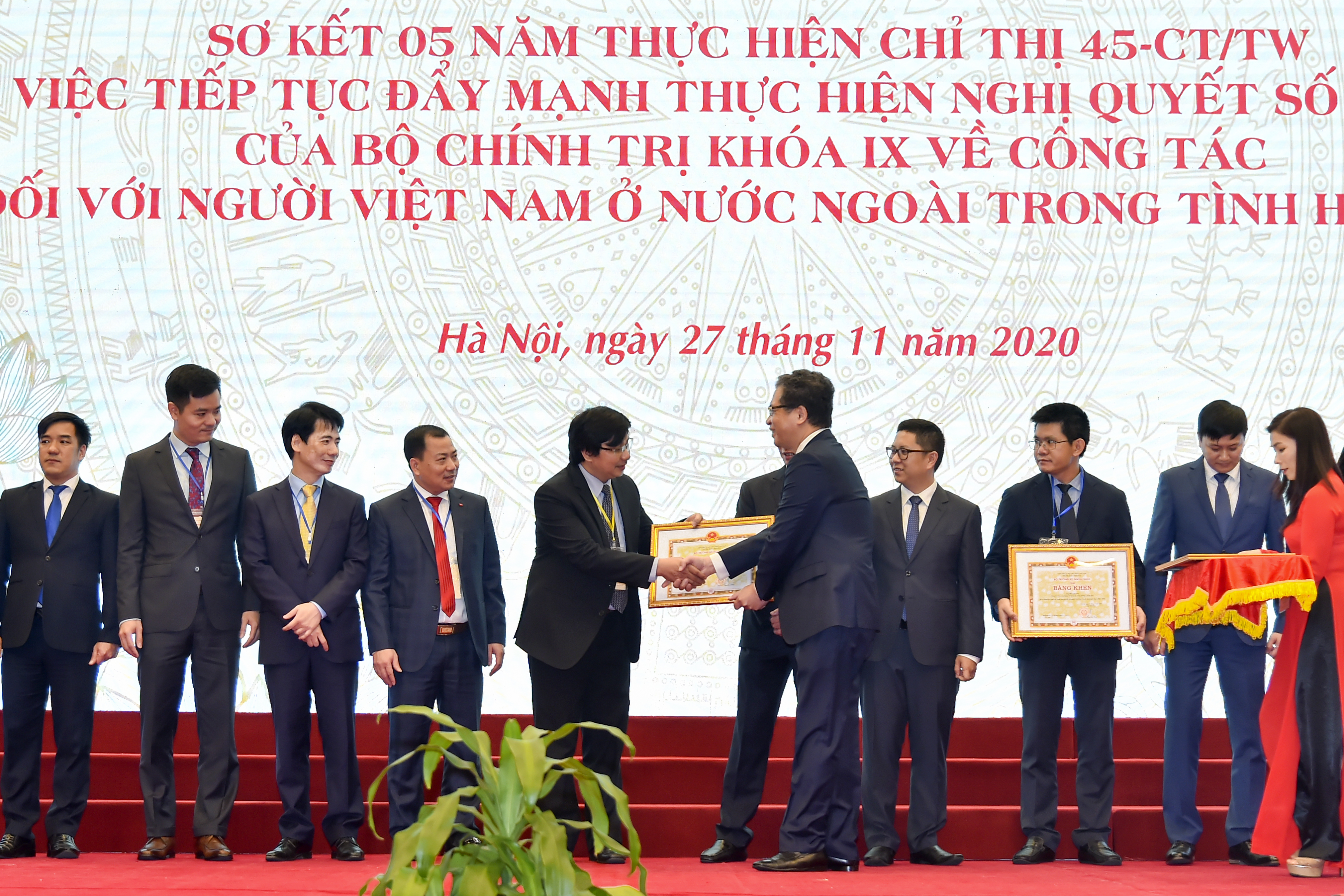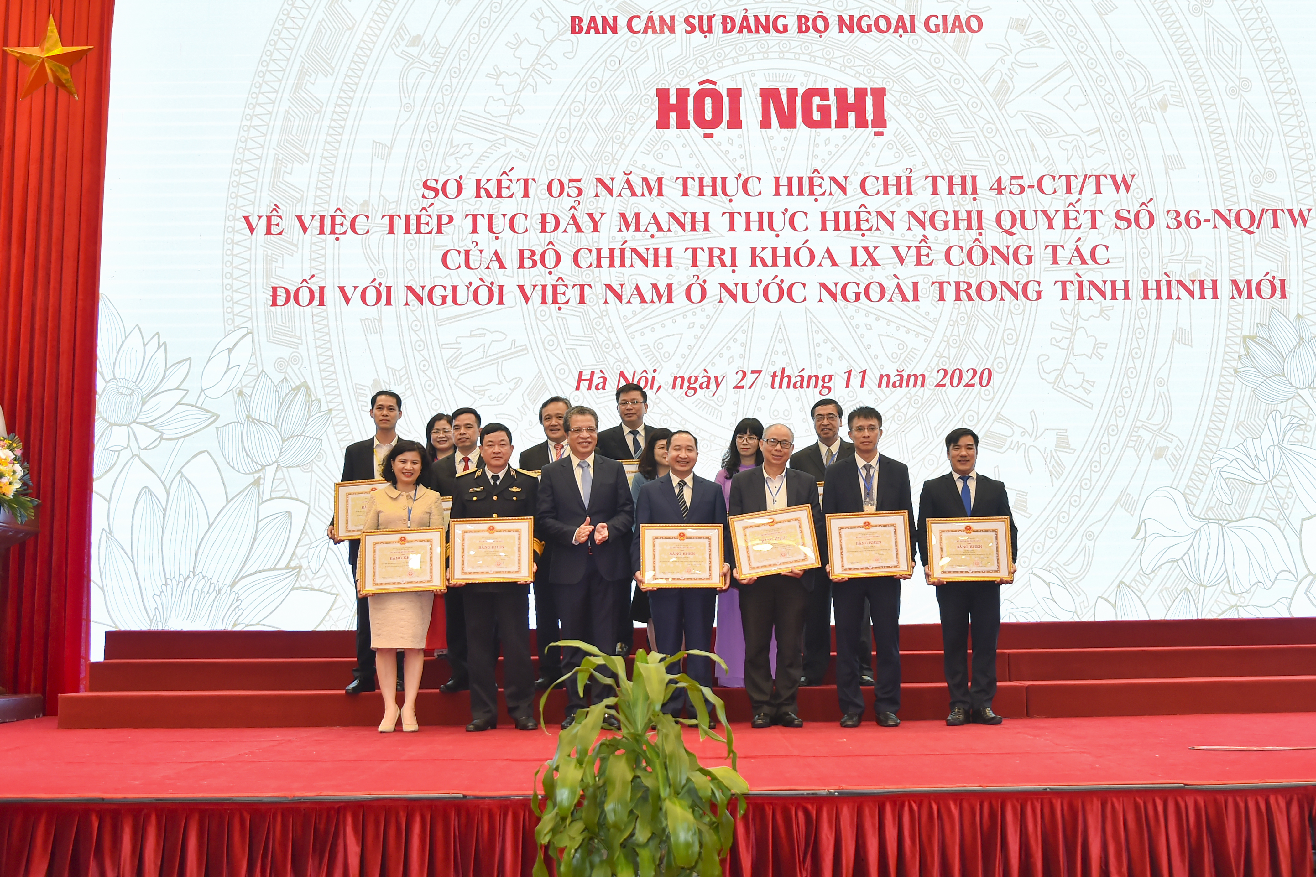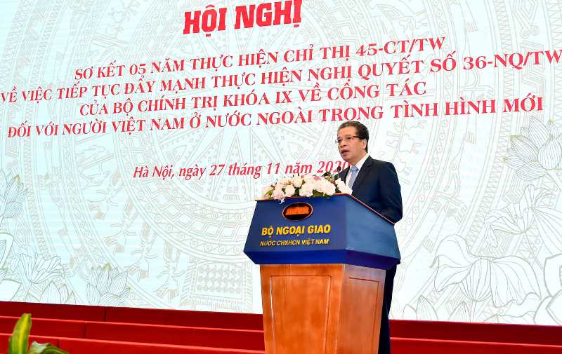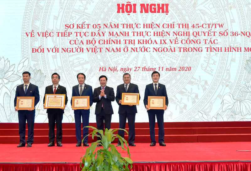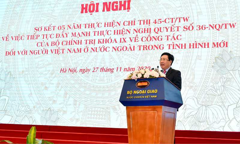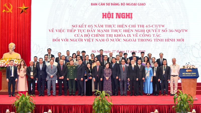 Ngày 27/11, tại Hà Nội, Bộ Ngoại giao Việt Nam chủ trì và phối hợp với các cơ quan tổ chức Hội nghị sơ kết 5 năm thực hiện Chỉ thị 45 - CT/TW (Chỉ thị 45) ngày 19/5/2015 của Bộ Chính trị về công tác đối với người Việt Nam ở nước ngoài trong tình hình mới. Tham dự Hội nghị có Ủy viên Bộ Chính trị, Phó Thủ tướng – Bộ trưởng Ngoại giao Phạm Bình Minh, các vị lãnh đạo, nguyên lãnh đạo Nhà nước, các ban, bộ, ngành cùng nhiều đại diện bà con kiều bào.