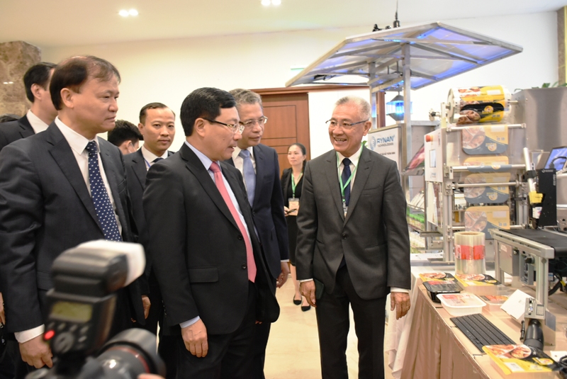 Phó Thủ tướng Phạm Bình Minh thăm gian hàng giới thiệu sản phẩm của công ty cổ phần RYNAN Techlologies Vietnam của TS Nguyễn Thanh Mỹ, kiều bào Canada - bên hành lang Hội nghị. |