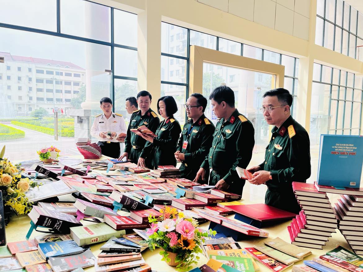 Các đại biểu tham quan khu trưng bày sách Điện Biên Phủ. Ảnh: Ánh Huyền |