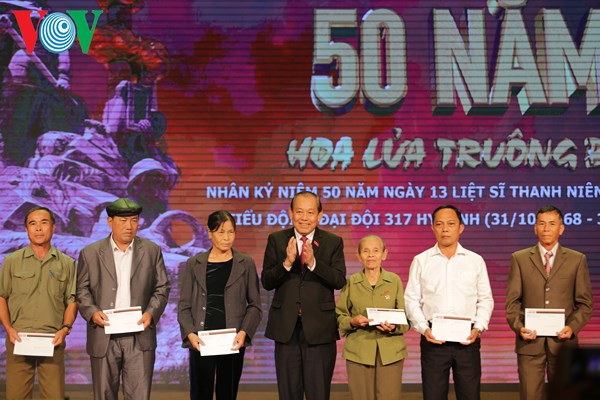 Cũng tại buổi giao lưu, Phó Thủ tướng thường trực Trương Hòa Bình thay mặt Ban tổ chức trao các phần quà tri ân gia đình của anh hùng liệt sĩ Tiểu đội 2 -Đại đội 317 - Đội 65 – Tổng đội Thanh niên xung phong chống Mỹ, cứu nước tỉnh Nghệ An.