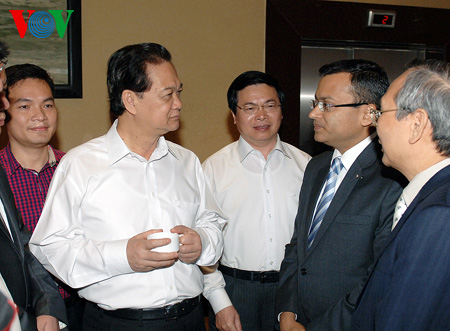| Thủ tướng lắng nghe và chia sẻ với các doanh nghiệp cơ khí trong và ngoài nước bên lề hội nghị (Ảnh: Nhật Bắc) |