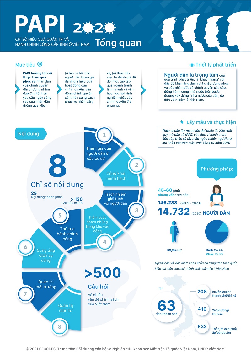 Báo cáo PAPI năm 2020 phản ánh đánh giá về hiệu quả điều hành, quản lý Nhà nước và cung ứng dịch vụ công của các cấp chính quyền của 14.732 người dân được chọn ngẫu nhiên ở 63 tỉnh thành Việt Nam, từ 18 tuổi trở lên, với đặc điểm nhân khẩu đa dạng.