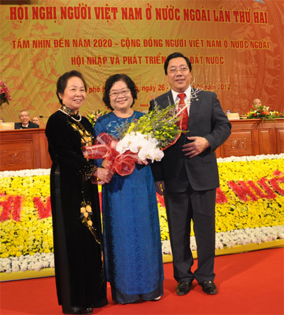 Bà Trương Mỹ Hoa, nguyên Phó Chủ tịch nước, nhận bó hoa tươi thắm và kỷ niệm chương Vì sự nghiệp công tác về NVNONN (Ảnh: quehuongonline)