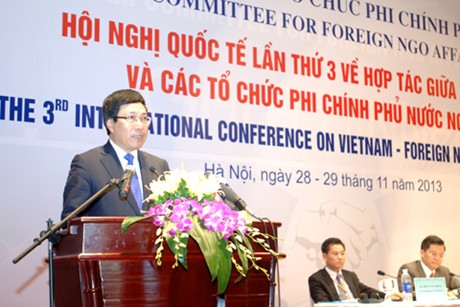 Phát biểu tại Hội nghị, Phó Thủ tướng chính phủ, Bộ trưởng Bộ ngoại giao Phạm Bình Minh đánh giá cao hiệu quả hợp tác của các tổ chức phi chính phủ nước ngoài tại Việt Nam thời gian qua, mong muốn các tổ chức phi chính phủ nước ngoài mở rộng hơn nữa sự hợp tác và giúp đỡ Việt Nam trong quá trình phát triển, nâng cao hơn nữa đời sống người dân: Tôi mong rằng các tổ chức phi chính phủ nước ngoài sẽ tiếp tục tăng cường hợp tác hiệu quả với chúng tôi trong các lĩnh vực thế mạnh của mình và phù hợp với nhu cầu cũng như luật pháp của Việt Nam. Phối hợp với các cơ quan và địa phương của Việt Nam xây dựng và triển khai các dự án thiết thực, hướng vào các ưu tiên về phát triển kinh tế xã hội, trước hết là giảm nghèo, tạo công ăn việc làm; cải thiện dịch vụ y tế, giáo dục xã hội, ngăn chặn dịch bệnh, giải quyết các vấn đề xã hội, bảo vệ môi trường, giảm nhẹ tiên tai, khắc phục hậu quả chiến tranh. Mở rộng sự giúp đỡ phát triển bằng các dự án lồng ghép dài hạn và nguồn tài trợ bền vững hơn, kết hợp nâng cao kiến thức, kỹ năng cho các cán bộ làm công tác phát triển, xoá đói giảm nghèo và người dân trong cộng đồng.