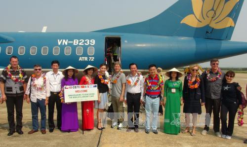 | Lãnh đạo Sở Văn hóa, Thể thao, Du lịch Quảng Bình đón đoàn Đại sứ tại Sân bay Đồng Hới. (Ảnh: TTXVN) |