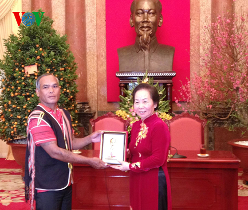 (VOV5)- Sáng 10/2, tại Phủ Chủ tịch, Phó Chủ tịch nước Nguyễn Thị Doan tiếp Đoàn đại biểu là già làng, trưởng bản, nghệ nhân, người có uy tín của 5 dân tộc thiểu số có dân số dưới 1000 người.