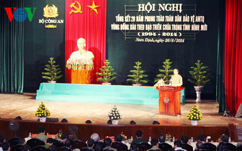 (VOV5) - Sáng nay, 26/8, tại tỉnh Nam Định, Bộ Công an tổ chức nghị toàn quốc tổng kết 20 năm thực hiện Chỉ thị số 11 về việc "Đẩy mạnh phong trào quần chúng bảo vệ an ninh Tổ quốc vùng đồng bào theo đạo Thiên chúa trong tình hình mới giai đoạn 1994- 2014".