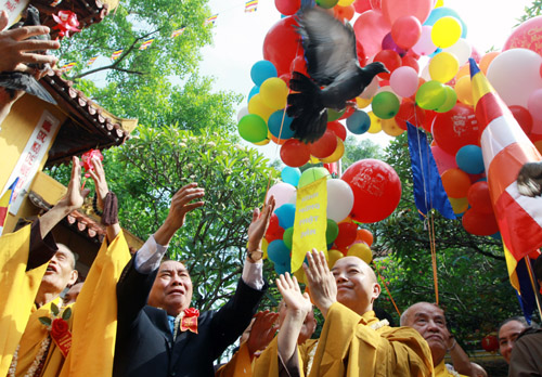 | Phó Thủ tướng Nguyễn Xuân Phúc cùng các đại biểu thực hiện nghi thức phóng sinh cầu quốc thái, dân an tại Đại lễ mừng Phật đản 2013 - Phật lịch 2557 (Ảnh: TTXVN) |