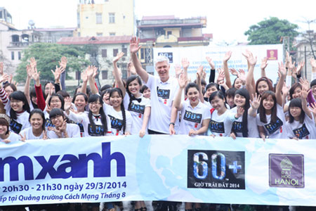 Sinh viên trường Đại học Hà Nội cùng các thành viên ban tổ chức hưởng ứng Chiến dịch “Giờ Trái Đất” 2014. Ảnh: QĐND.