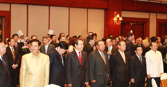 | Bà con Việt kiều cùng các nhà lãnh đạo Lào trong dạ tiệc mừng 67 năm Quốc khánh Việt Nam (tối 30/8) |