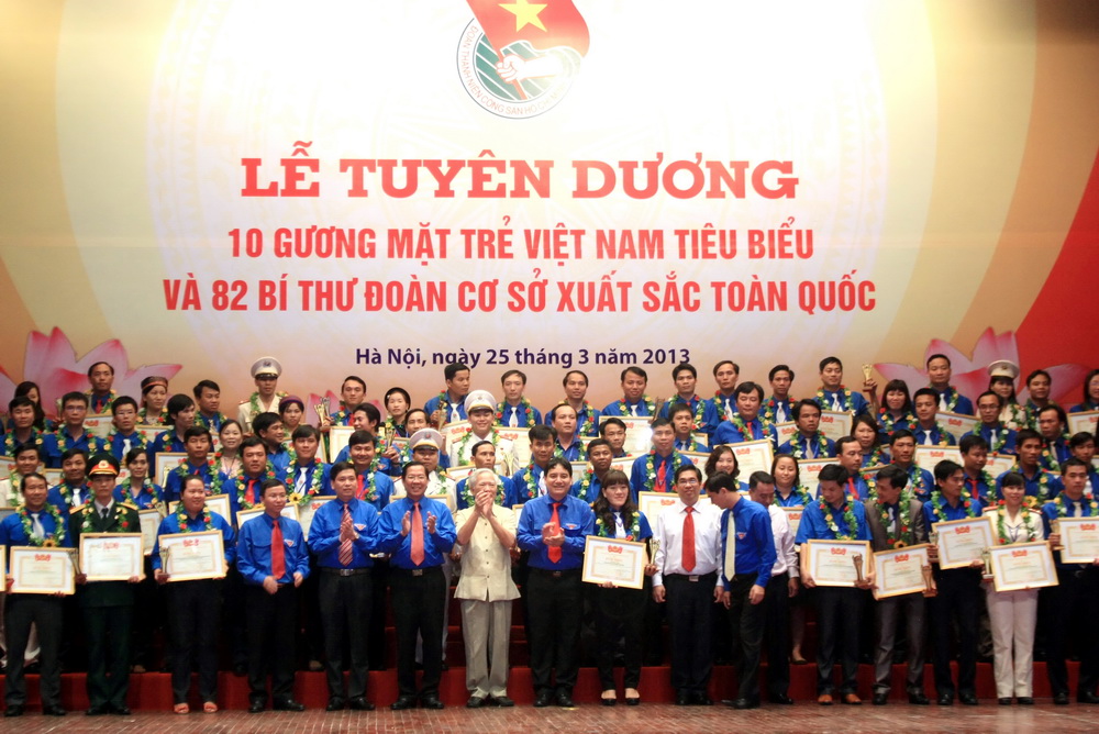 (VOV5) - Tối 25/3, tại Hà Nội, Trung ương Đoàn TNCS Hồ Chí Minh tổ chức trao giải thưởng 10 gương mặt trẻ Việt Nam tiêu biểu và 82 Bí thư Đoàn cơ sở xuất sắc nhận giải thưởng 26/03. 10 bạn được nhận giải thưởng là những gương mặt trẻ xuất sắc đại diện các đoàn viên thanh niên trên cả nước, có những đóng góp thiết thực cho xã hội và đất nước gồm: Ngô Phi Long, học sinh Trường THPT chuyên tỉnh Sơn La; Nguyễn Huỳnh Đông, Trưởng khoa Dầu khí, Cao đẳng Nghề Dầu khí, Tập đoàn Dầu khí Quốc gia Việt Nam; Hồ Vĩnh Hoàng, Công ty cổ phần robot TOSY; Trần Thị Thuấn Hoa, xã Nam Cường, huyện Tiền Hải, Thái Bình; Nguyễn Thanh Tài, cụm chiến đấu 1, đảo Trường Sa, Lữ đoàn 146, Bộ Tư lệnh vùng 4 Hải quân; Nguyễn Tiến Hải, Đội trưởng Đội điều tra tổng hợp, Công an huyện Sóc Sơn, Hà Nội; ca sĩ Nguyễn Tùng Dương; ca sĩ Thái Thùy Linh; vận động viên thể thao Phan Thị Hà Thanh; Đỗ Hoàng Giang, Bí thư Đoàn xã Phú Thành, huyện Tam Nông, Đồng Tháp.