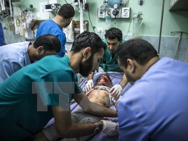 | Một bé gái Palestine bị thương trong cuộc không kích của Israel điều trị tại bệnh viện ở Beit Lahia, phía bắc Dải Gaza ngày 22/7. (Nguồn: AFP/TTXVN) |