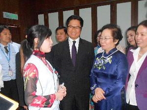 | Phó Chủ tịch nước Nguyễn Thị Doan gặp gỡ công nhân Việt Nam đang làm việc tại Nhà máy SONY EMCS Malaysia Snd.Bhd. (Ảnh: Thống Nhất/TTXVN) |