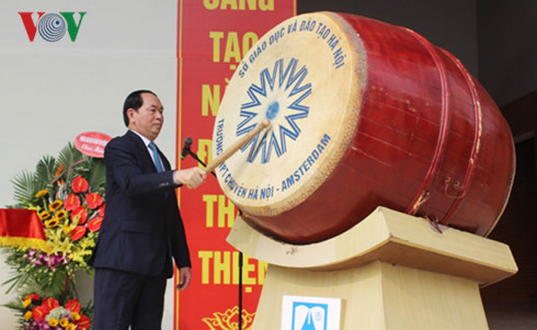 | Chủ tịch nước Trần Đại Quang đánh trống khai giảng năm học mới tại trường THPT chuyên Hà Nội-Amsterdam. |