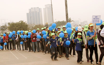 | Thành viên CLB gia đình trẻ tự kỷ Hà Nội và các tình nguyện viên đi bộ để hưởng ứng ngày thế giới nhận thức chứng tự kỷ. |