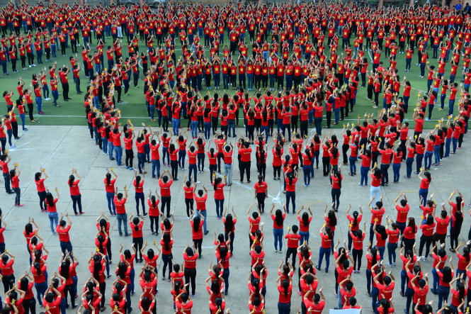 | 2.000 thanh niên đồng diễn bài hát Đến với con người Việt Nam tôi (Ảnh: tuoitre.vn) |