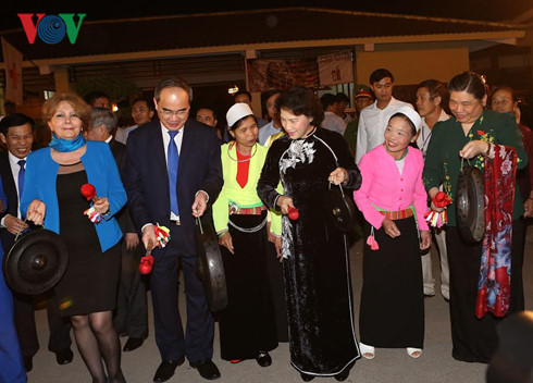 | Chủ tịch Quốc hội Nguyễn Thị Kim Ngân và Chủ tịch Ủy ban MTTQ VN Nguyễn Thiện Nhân tham gia đánh cồng chiêng cùng đồng bào Mường. |