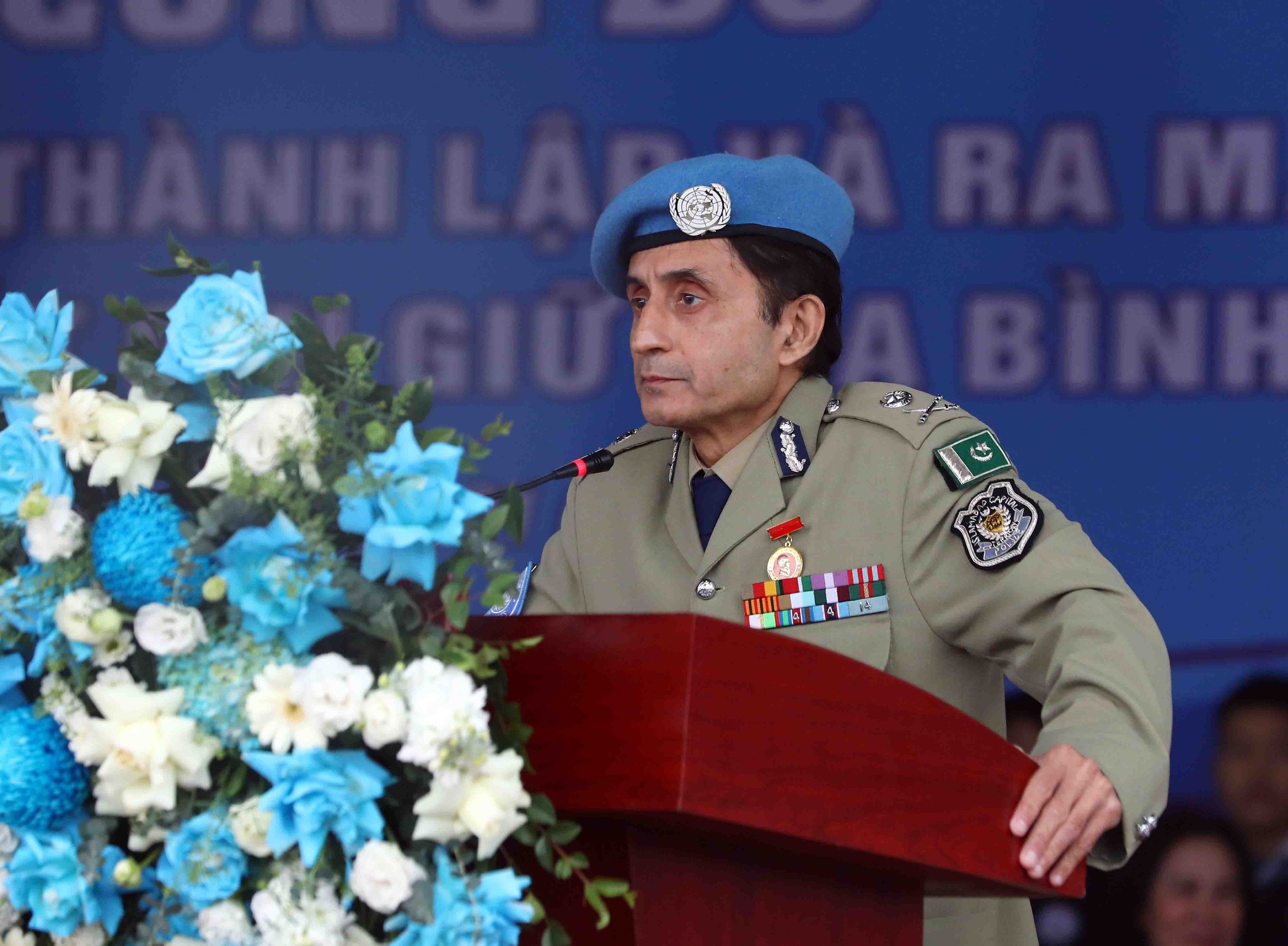 Ông Faisal Shahkar, Tư lệnh Cảnh sát Liên hợp quốc phát biểu tại buổi lễ. Ảnh: Vĩnh Phong |