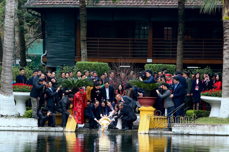 Chủ tịch nước cùng phu nhân và bà con kiều bào thả cá chép - Ảnh: vietnamnet.vn |