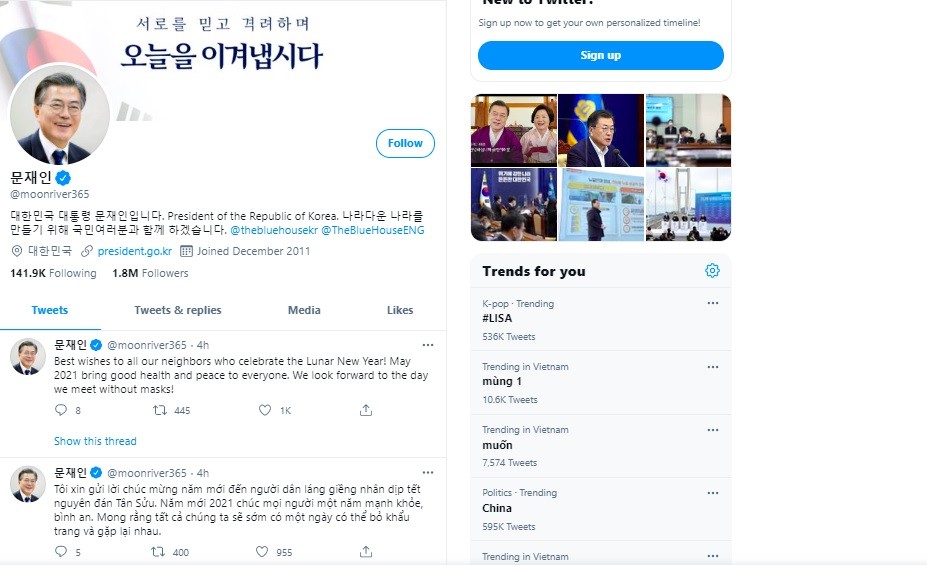 Tổng thống Hàn Quốc gửi lời chúc Tết Nguyên đán đến các nước láng giềng tại: https://twitter.com/moonriver365 |
