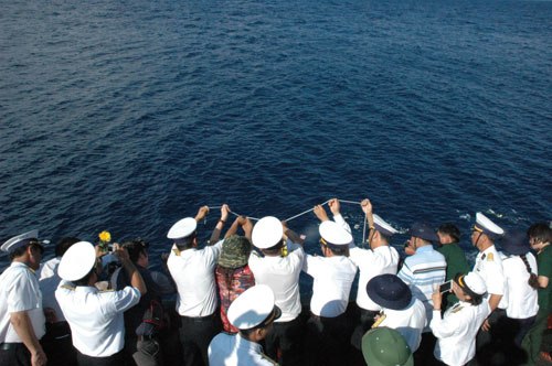 Đoàn công tác đã dành một phút mặc niệm các cán bộ, chiến sỹ và thả những vòng hoa tưởng niệm xuống biển Phúc Nguyên./.