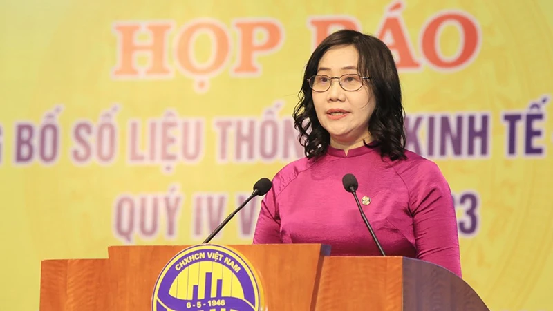 Bà Nguyễn Thị Hương, Tổng cục trưởng Tổng cục Thống kê (Bộ Kế hoạch và Đầu tư) tại cuộc họp báo công bố số liệu thống kê kinh tế-xã hội quý IV và năm 2023. Ảnh: TTXVN |
