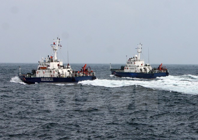 | Tình huống diễn tập của tàu cảnh sát biển Việt Nam trên biển. (Ảnh: Trọng Đức/TTXVN) |