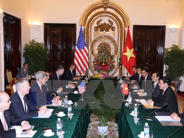 Trả lời câu hỏi của phóng viên về triển vọng hoàn tất Hiệp định Đối tác xuyên Thái Bình Dương (TPP), Ngoại trưởng Hoa Kỳ John Kerry cho biết: "Đã có những tiến bộ nhưng vẫn còn những vấn đề tồn đọng, mà hôm nay chúng tôi đã thảo luận những vấn đề liên quan đến Việt Nam. Các nước khác cũng có những vấn đề phải giải quyết trong những ngày tới để hy vọng TPP sẽ được hoàn tất vào dịp cuối năm nay". Trao đổi với phóng viên về vấn đề nhân quyền, Ngoại trưởng Hoa Kỳ cho biết: Hai nước đã thảo luận thường xuyên và thẳng thắn về vấn đề này, ngay từ khi mới bắt đầu quá trình bình thường hóa quan hệ. Việt Nam vừa phê chuẩn Công ước Liên hợp quốc về chống tra tấn, sửa đổi và thông qua các luật để cụ thể hóa Hiến pháp năm 2013 như bộ luật Hình sự, Tố tụng hình sự, cải cách tư pháp... Về vấn đề Biển Đông, Ngoại trưởng John Kerry bày tỏ quan ngại của Hoa Kỳ trước việc quân sự hóa, lấn đảo, đồng tình phải giải quyết tranh chấp bằng biện pháp hòa bình, ngoại giao hoặc thông qua tòa án quốc tế. Ngoại trưởng Hoa Kỳ nhận định, việc Việt Nam tham gia lực lượng gìn giữ hòa bình Liên hợp quốc là một bước tiến quan trọng, khi mà Liên hợp quốc đang phải nỗ lực tìm kiếm nguồn lực cho công tác gìn giữ hòa bình.