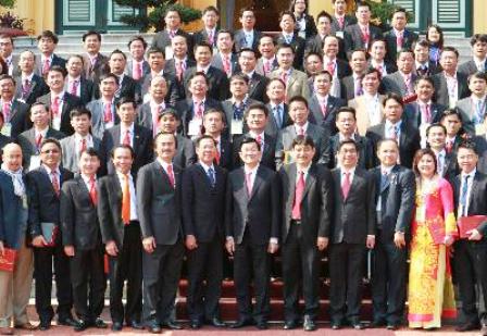 | Chủ tịch nước Trương Tấn Sang thân mật tiếp, chụp ảnh kỷ niệm với các doanh nhân trẻ Việt Nam tại Phủ Chủ tịch ngày 26/12/2011 (Ảnh: TTXVN) |