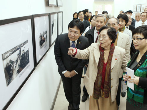 | Nguyên Phó Chủ tịch nước Nguyễn Thị Bình và các đại biểu tham quan triển lãm ảnh về Hiệp định Paris |