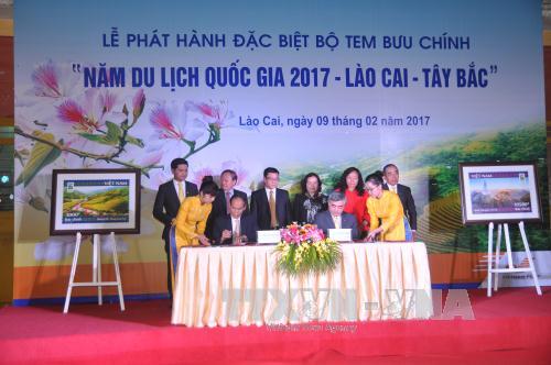 | Lãnh đạo UBND tỉnh Lào Cai và Lãnh đạo Bộ Thông tin và Truyền thông ký kết phát hành Bộ tem "Năm du lịch quốc gia 2017 Lào Cai - Tây Bắc" (Ảnh: baotintuc.vn) |