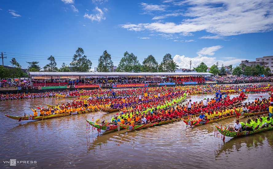 Đua ghe ngo là nét văn hóa độc đáo của người Khmer và là hoạt động không thể thiếu trong Lễ hội Oók Om Bók. Ảnh: VNExpress |