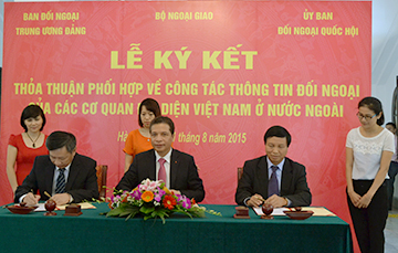 (VOV5) - Ngày 11/8, tại Trụ sở Bộ Ngoại giao, Bộ Ngoại giao, Ban Đối ngoại Trung ương Đảng và Ủy ban Đối ngoại Quốc hội ký Thỏa thuận phối hợp về công tác thông tin đối ngoại của các Cơ quan đại diện Việt Nam ở nước ngoài.