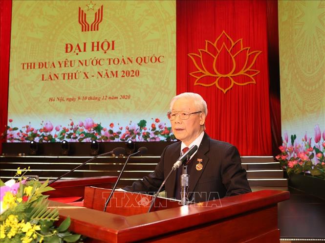Tổng Bí thư, Chủ tịch nước Nguyễn Phú Trọng phát biểu chào mừng Đại hội Thi đua yêu nước toàn quốc lần thứ X. - Ảnh: Trí Dũng/TTXVN |