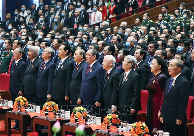 Các lãnh đạo, nguyên lãnh đạo Đảng Nhà nước và đại biểu thực hiện nghi lễ chào cờ. - Ảnh: Thống Nhất/TTXVN |