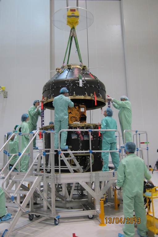 | Vệ tinh VNREDSat-1 được các chuyên gia đưa vào khoang chở hàng của tên lửa đẩy VEGA ngày 13/4/2013. (Ảnh: chinhphu.vn) |