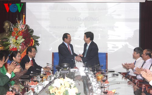 Sáng cùng ngày, Trưởng ban Tuyên giáo Trung ương Đinh Thế Huynh đến thăm và chúc mừng Hội Nhà báo Việt Nam, Thông tấn xã Việt Nam, Báo Nhân dân, Đài Tiếng Nói Việt Nam, Báo Công an nhân dân và Báo Quân đội Nhân dân. Đến thăm Đài Tiếng nói Việt Nam, ông Đinh Thế Huynh nhấn mạnh: Tôi mong Đài Tiếng nói Việt Nam phát huy truyền thống vẻ vang 70 năm qua, cũng như những kinh nghiệm tích lũy được trong 70 năm qua. Đặc biệt là trong những năm gần đây với đội ngũ đông đảo hùng hậu, phương tiện vật chất kỹ thuật phong phú, Đài Tiếng nói Việt Nam cần làm tốt hơn chức năng, nhiệm vụ của Đài phát thanh Quốc gia, lĩnh xướng trên lĩnh vực báo nói, làm phong phú hơn lĩnh vực tryền hình, nâng cao chất lượng, trở thành tổ hợp truyền thông đa phương tiện hùng mạnh.
