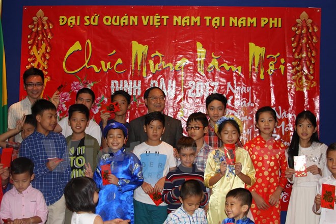 | Đại sứ Vũ Văn Dũng chúc Tết các cháu thiếu nhi con em cộng đồng người Việt tại Nam Phi nhân dịp Tết Đinh Dậu 2017. (Ảnh: Mạnh Hùng/Vietnam+) |