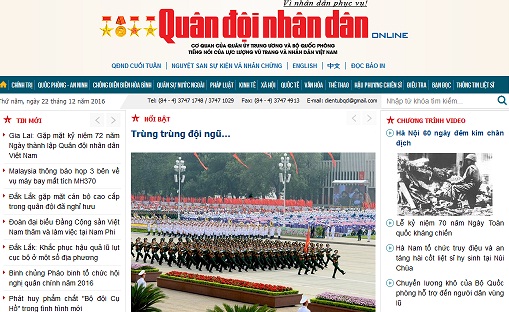 Hôm nay kỷ niệm 72 năm ngày thành lập Quân đội nhân dân Việt Nam (22/12/1944-22/12/2016) và 27 năm Ngày hội Quốc phòng toàn dân (22/12/1989-22/12/2016), trên các báo lớn của Việt Nam đăng nhiều tin, bài, ảnh về chủ đề này.