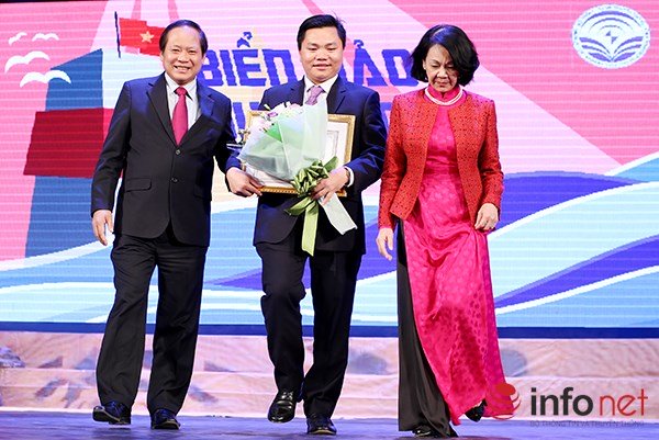 | Ủy viên Bộ Chính trị, Bí thư Trung ương Đảng, Trưởng Ban Dân vận Trung ương Trương Thị Mai và Uỷ viên trung ương Đảng, Bộ trưởng Bộ Thông tin và Truyền thông Trương Minh Tuấn trao giải Nhất cuộc thi và động viên tác giả Nguyễn Đình Phú tiếp tục phát huy tinh thần học tập để góp phần bảo vệ chủ quyền Tổ quốc. Ảnh:thanhnien.com.vn |