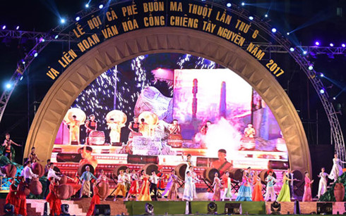 | Một tiết mục văn nghệ tại buổi khai mạc Lễ hội cà phê Buôn Ma Thuột lần thứ 6 và Liên hoan cồng chiêng Tây Nguyên năm 2017. |