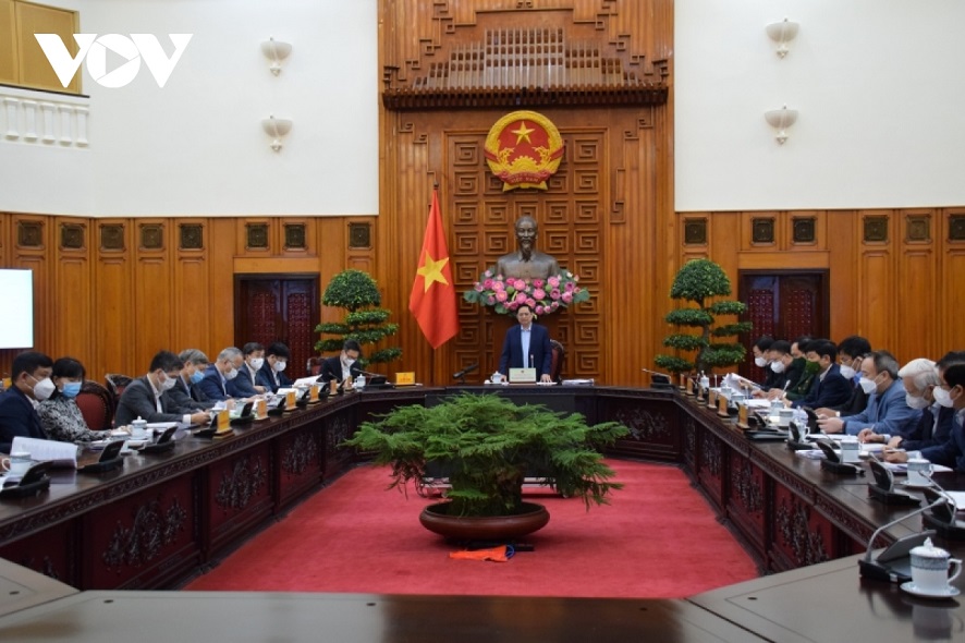 Thủ tướng Chính phủ Phạm Minh Chính chủ trì họp với các bộ, ngành, đơn vị về thúc đẩy nghiên cứu, chuyển giao công nghệ sản xuất vaccine, thuốc điều trị COVID-19 trong nước. Ảnh: VOV |