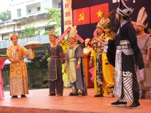 | Sân khấu hóa lịch sử các Vua Hùng tại các trường học ở TP Hồ Chí Minh góp phần phát huy giá trị của tín ngưỡng thờ cúng Hùng Vương. Ảnh: Minh Anh |