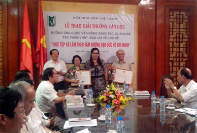 | Đại diện Hội Nhà văn Việt Nam và Ban Tuyên giáo Trung ương trao thưởng cho hai tác phẩm đoạt giải thưởng. (Ảnh:qdnd) |