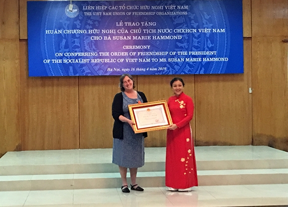 Ngày 16/4, tại Hà Nội, Chủ tịch Liên hiệp các tổ chức hữu nghị Việt Nam (VUFO) Nguyễn Phương Nga trao Huân chương Hữu nghị tặng bà Susan Hammond (quốc tịch Mỹ), người sáng lập đồng thời là Giám đốc Chương trình của Tổ chức War Legacies Project (WLP) tại Việt Nam.