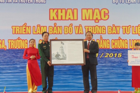 Triển lãm do Bộ Thông tin và Truyền thông phối hợp với Bộ tư lệnh Thủ đô tổ chức, diễn ra sáng nay (20/11) tại Hà Nội. Triển lãm lần này giới thiệu nhiều tư liệu, văn bản, hiện vật, ấn phẩm và bản đồ tiêu biểu như: Phiên bản của các văn bản Hán- Nôm, văn bản Việt Ngữ và Pháp ngữ do triều đình phong kiến Việt Nam và chính quyền Pháp ở Đông Dương; các châu bản triều Nguyễn (từ triều Gia Long đến triều Bảo Đại) ban hành liên quan trực tiếp đến vấn đề khai thác, quản lý, xác lập và thực thi chủ quyền đối với hai quần đảo Hoàng Sa và Trường Sa dưới triều Nguyễn (1802-1945); bộ sưu tập 65 bản đồ chứng minh chủ quyền của Việt Nam đối với quần đảo Hoàng Sa và Trường Sa…